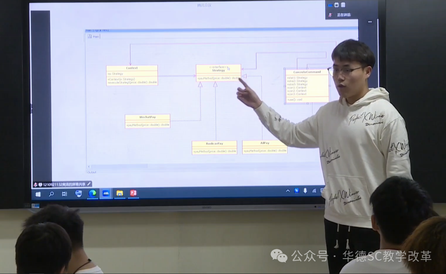 在数据科学与信息工程学院的《软件设计模式》课堂上,一场别开生面的代码重构竞演正在进行。同学们以小组为单位,依次登台展示他们运用设计模式对“校园快送”系统进行的优化方案,当一组同学借助策略模式巧妙化解项目中多重条件判断难题、使系统扩展性大幅提升时,台下响起热烈的掌声。这充满思维碰撞、创新活力的场景,正是《软件设计模式》课程深入践行“以学生为中心”教学改革的缩影,课程通过“做中学”将抽象的设计模式转化为可触摸的实践成果。