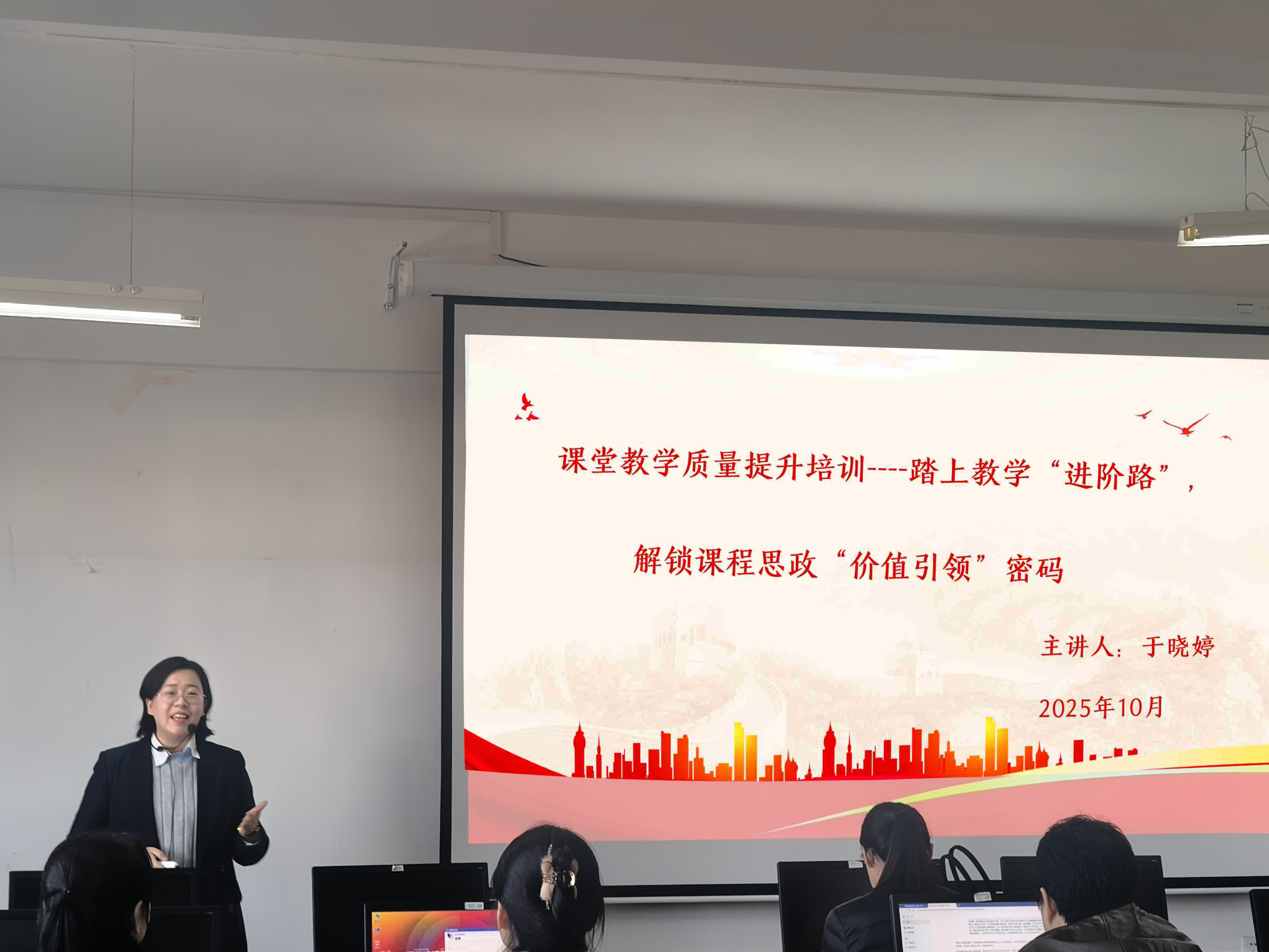 为破解教师在课程思政建设中“挖掘难、融入浅”的痛点,扎实落实立德树人根本任务,实现知识传授与价值引领的同频共振,10月30日,学院特邀请软件工程系教师、校级教学督导于晓婷老师,开展题为《踏上教学‘进阶路’-解锁课程思政‘价值引领’密码》的专题培训。本次培训会在第六教学楼507室举行,由学院教学副院长姜楠楠主持,全院教师齐聚一堂,就课程思政的挖掘、融入及实践落地等关键议题深入研讨。