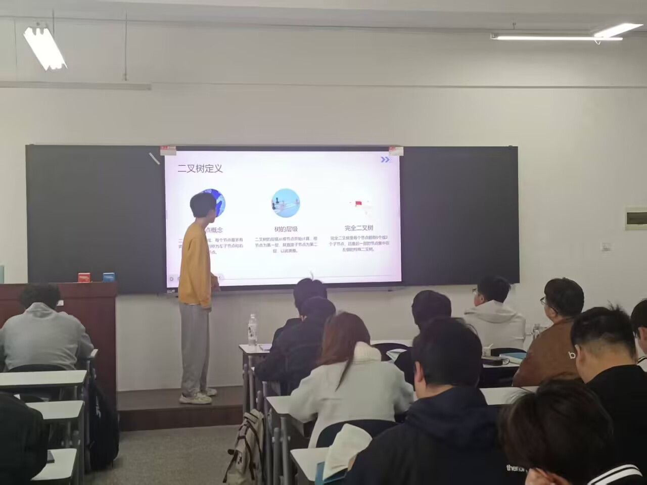 学生化身小老师,为同学细致讲解二叉树的核心知识,用沉浸式实践打破了传统课堂的边界。通过以教促学的方式,激发学生主动学习的热情,帮助大家在实践中构建完整的知识体系。这种教学模式,让同学们从知识的接收者转变为传播者。走上讲台的同学在备课、讲解的过程中,不仅深化了对二叉树理论的理解,更锻炼了逻辑表达与临场应变能力;台下同学也表示,同龄人视角的讲解更贴近学习思维,互动式课堂让原本抽象的算法知识变得直观易懂。