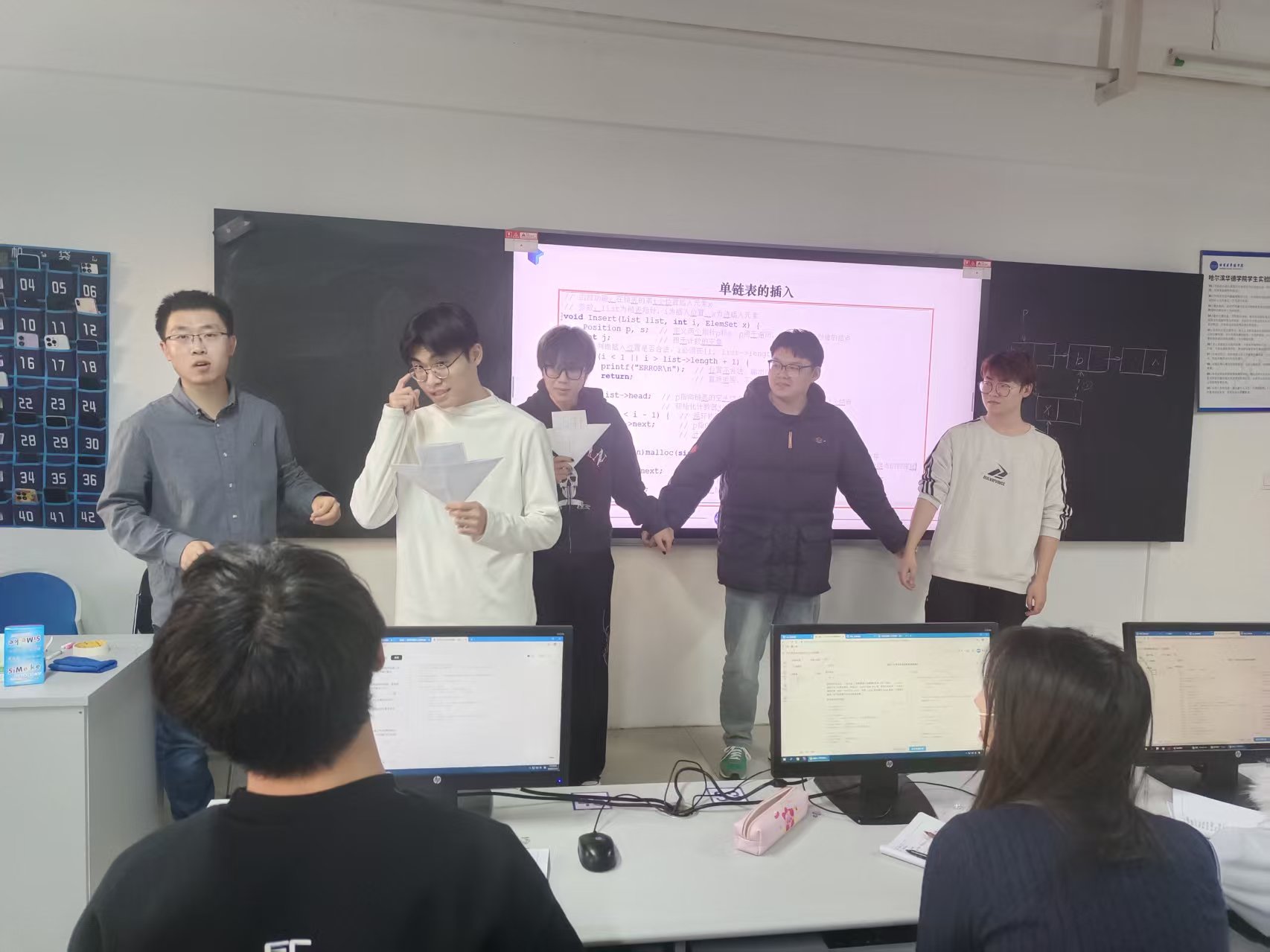 课堂上,同学主动站到台前,结合投影屏幕上的代码示例与黑板上的结构示意图,从算法逻辑、代码实现到操作细节,条理清晰地分享着自己对单链表插入操作的理解。他们手持讲稿,从容地拆解步骤、分析原理,时而与台下同学互动提问,时而在黑板上推演节点变化,生动还原了数据结构的运行逻辑。台下同学也积极响应,或认真记录要点,或针对疑问展开讨论,整个课堂氛围活跃而专注。