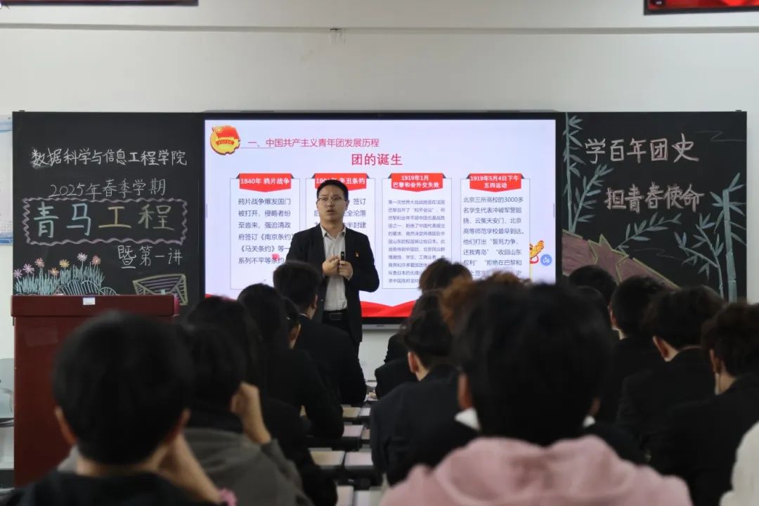 为深入学习贯彻习近平新时代中国特色社会主义思想,扎实推进党的创新理论学习宣传,着力提升学生骨干思想境界与综合素养,4月8日,数据科学与信息工程学院精心组织开展“青马工程”专题培训活动。学生发展中心副主任、第四党支部书记苏军老师主讲,学生发展中心副主任兼团总支书记藏成泽出席活动。现场,近百名学生骨干认真聆听课程,苏军老师围绕团史脉络、青春使命等核心内容展开分享,结合新时代青年成长需求深入解析理论内涵,引导学员筑牢理想信念根基、强化责任担当意识。