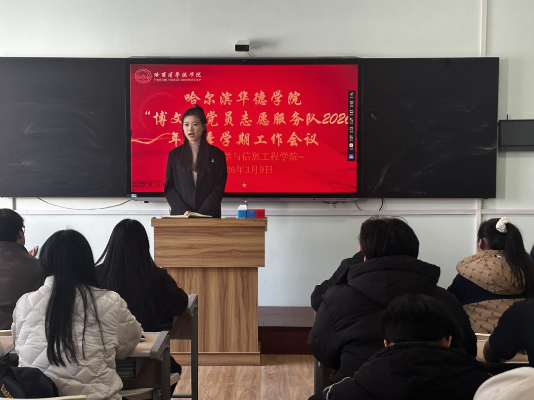 为深入落实学校2026年春季学期重点工作部署,充分发挥学生党员先锋模范作用,强化党员示范引领作用,推动党建工作与学风建设深度融合。2026年3月9日,哈尔滨华德学院“博文”党员志愿服务队召开2026年春季学期工作会议。会议由“博文”党员志愿服务队指导教师常远主持,各学生党支部书记及全体学生党员参加会议。