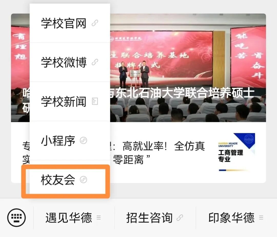 打开微信,关注“哈尔滨华德学院”公众号,在菜单栏点击“遇见华德”,选择“校友会”进入小程序。点击首页“校友电子卡”,填写相关信息并提交申请,审核通过后即可领取校友卡。