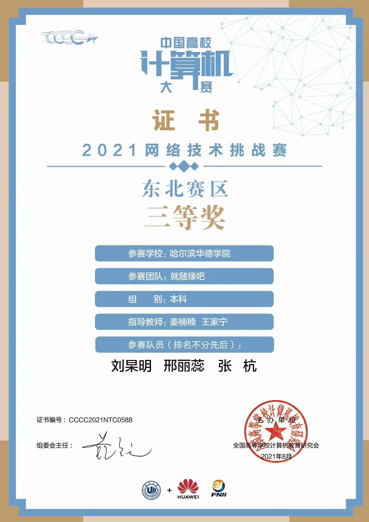 大学期间,张杭多次获得国家励志奖学金、校级奖学金,并与团队在2021年网络技术挑战赛东北赛区中荣获三等奖。更令他难忘的是毕业设计期间导师的悉心指导。在考研复习与毕业设计交织的忙碌日子里,导师主动帮他梳理思路、纠正错误、演练流程。“那份耐心与鼓励,让我在学术与人生的交叉路口走得更加坚定。”张杭深情地回忆道。