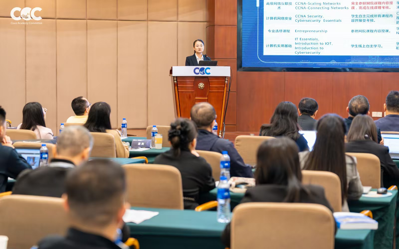 在介绍《计算机网络》课程创新实践时,姜楠楠副院长详细阐述了通过内容重构、教学资源建设、教学方法创新、多元考评体系四个方面的改革措施。学院充分利用思科网院平台资源,将产业新技术、新工艺融入课程体系,创新性地采用项目式学习、案例教学、虚实结合实验等方法,构建了完整的产教融合课程体系。