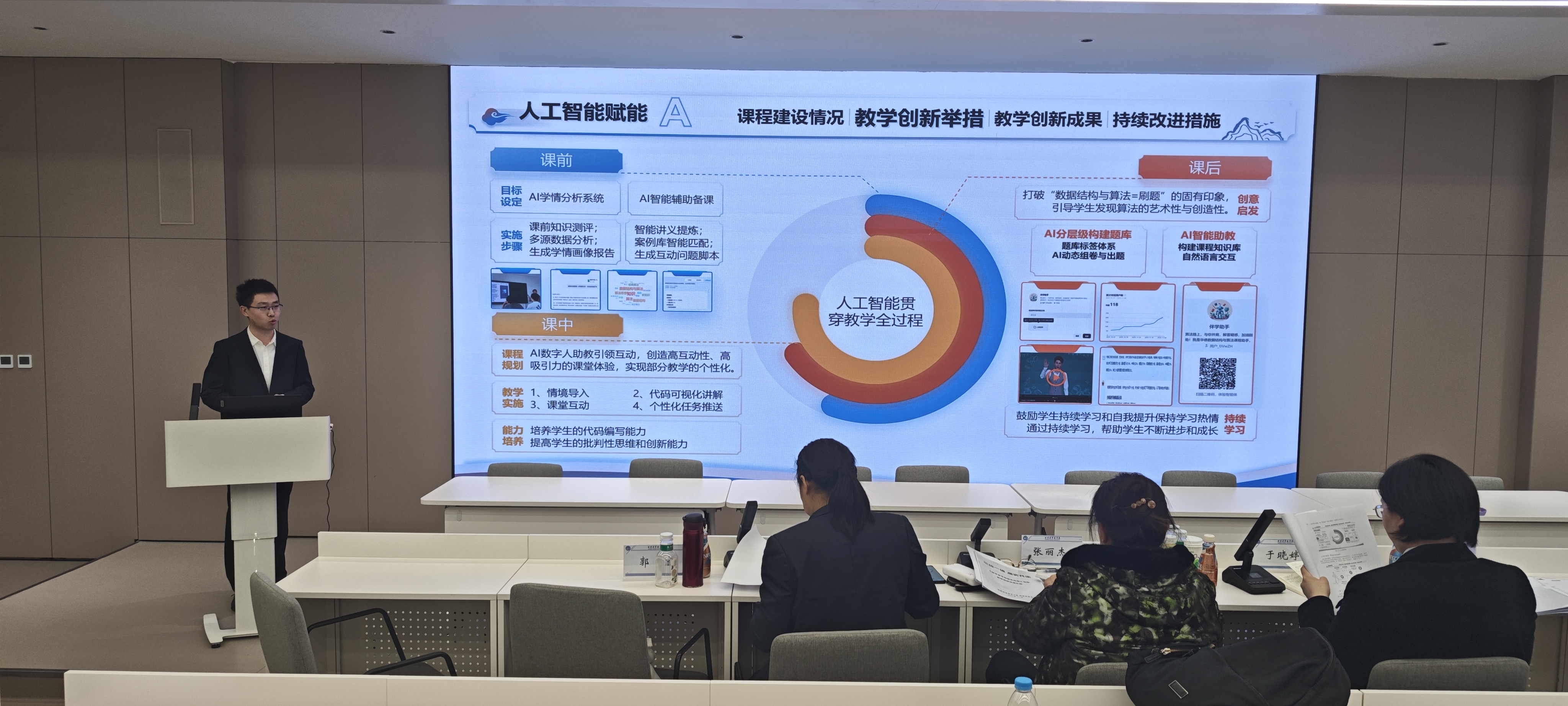 比赛现场,高潮迭起,精彩不断。参赛教师们基于扎实的教学实践与深刻的反思,紧紧围绕OBE理念,以学生能力达成为目标,精心设计了各自的教学环节。他们或通过巧妙的教学形式激发学生兴趣,或凭借严密的逻辑梳理知识体系,或以富有感染力的语言教态营造沉浸式课堂氛围,更有教师将前沿科技、产业案例与课程内容深度融合,充分展示了数据科学与信息工程学院教师在教学内容、方法、模式上的创新成效与独特风采。