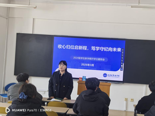 随后,各班级陆续召开新学期第一次主题班会。班会上,辅导员向全体学生传达了学校关于新学期教学安排、校园管理、安全稳定等方面的具体要求,强调了按时返校注册、遵守课堂纪律、积极参与校园文化活动等事项。同时,辅导员还就学风建设、心理健康、生涯规划等与学生进行了交流,鼓励同学们以积极饱满的精神状态投入新学期的学习生活,共同营造勤学、修德、明辨、笃实的优良学风。