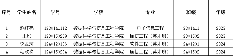 为落实立德树人根本任务,助力教育高质量发展,2023年,国家开发银行联合交通银行、招商银行、平安银行每年向中国教育发展基金会捐赠资金,共同设立“筑梦奖学金”项目(以下简称项目)。项目资金用于奖励获得过国家开发银行承办的国家助学贷款的学生中,品学兼优的全日制本专科生,激励他们努力向学、奋斗向上、自强不息、成长成才。数据科学与信息工程学院根据筑梦奖学金评选条件,组织学生参加申请,通过提交申请材料、民主评议、分院联评等方式确定学院拟推荐学生名单,现将拟获2025年度筑梦奖学金学生情况公示如下: