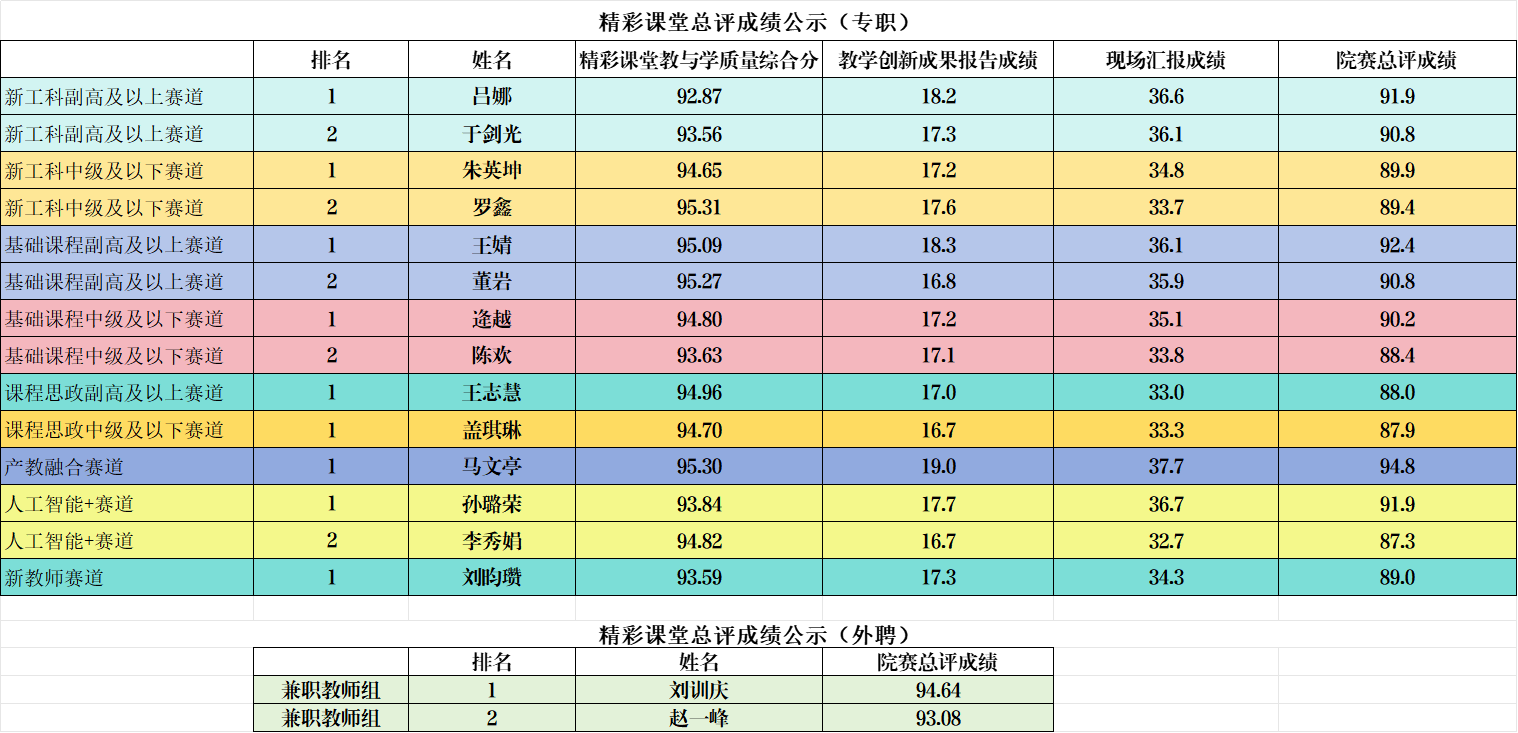 根据学校关于精彩课堂的相关文件精神,学院组织了精彩课堂院级比赛。经过现场比拼,最终成绩按照学校相关文件要求构成。经统计汇总和院级评审会审核,按总成绩确定了各赛道排名,拟推荐以下14名专职教师和2名外聘教师参加校级比赛。现将院赛成绩予以公示。