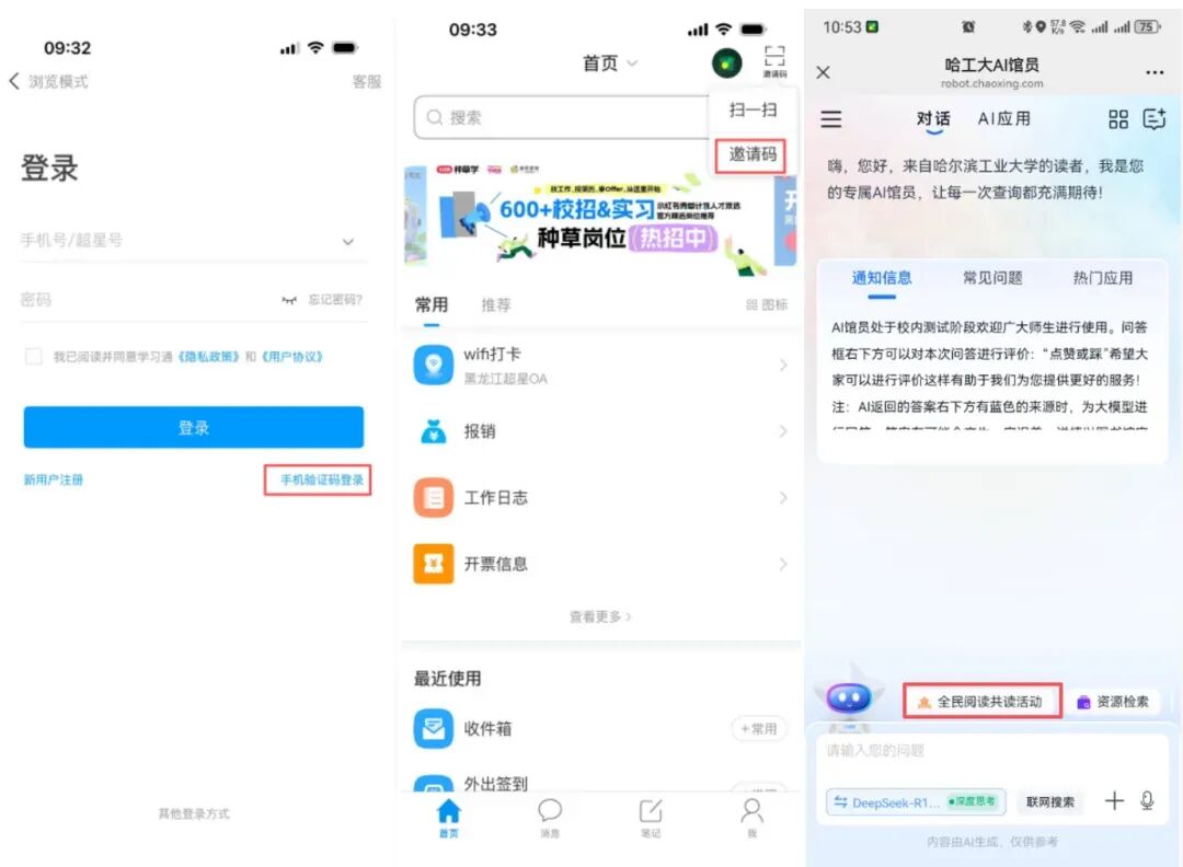 2.使用手机号获取验证码方式进行登录,首页右上角输入本单位邀请码yzhdxy进入图书馆页面,点击AI馆员进入后,然后点击下方全民阅读共读活动即可参与。